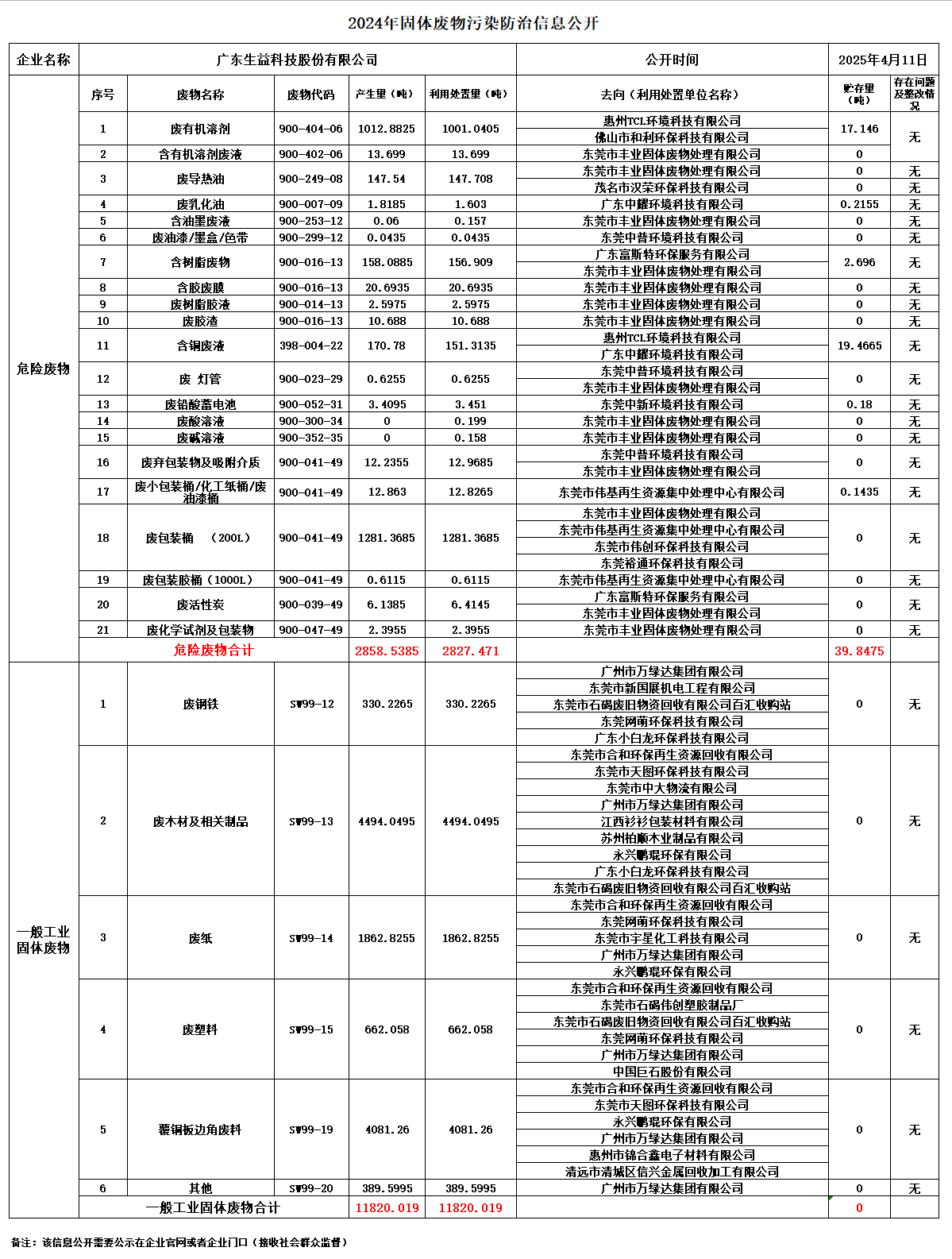广东必发唯一登录股份有限公司2024上半年危险废物污染防治责任信息公开